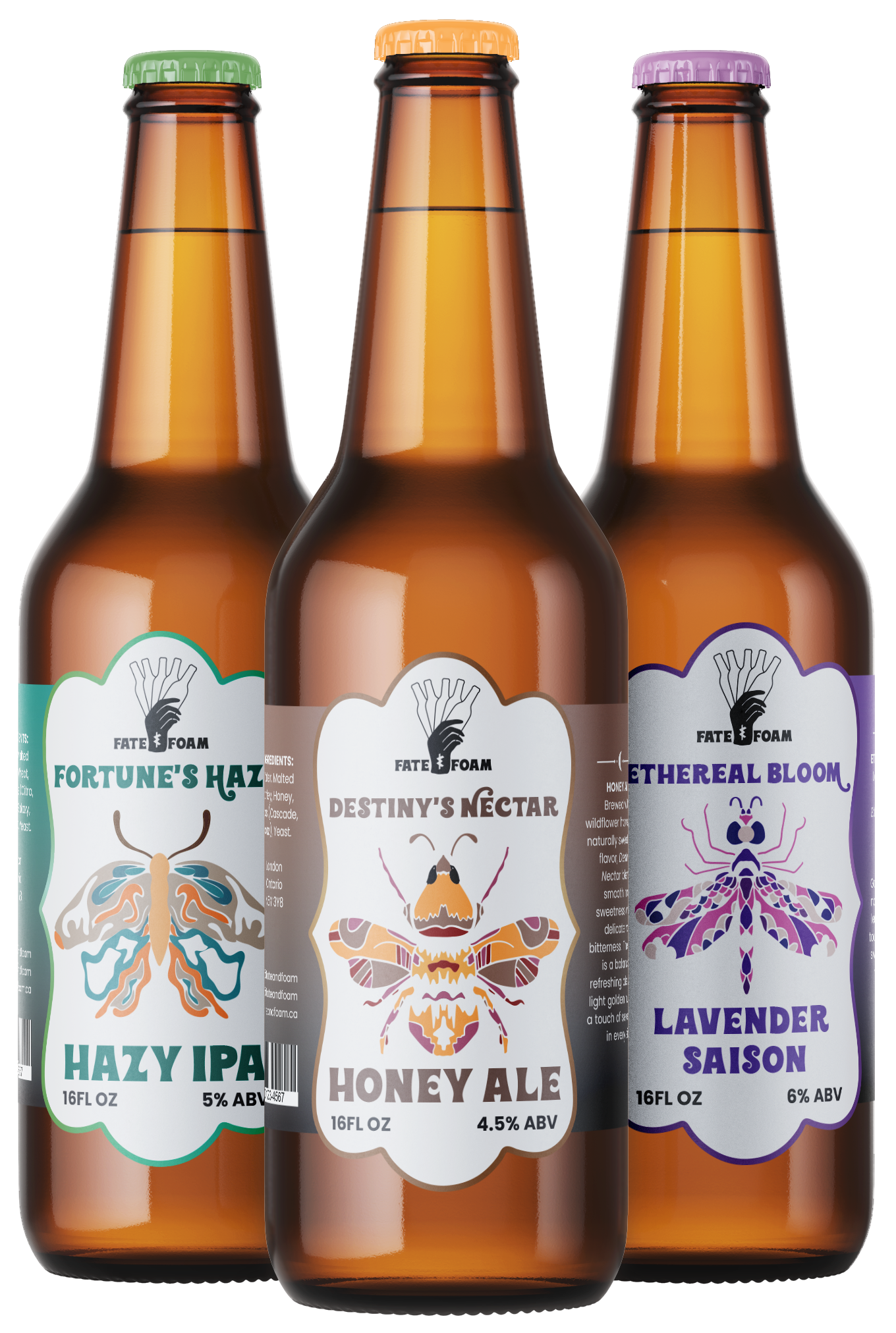 Fate & Foam required packaging for three new craft beer flavours that would establish a distinctive brand identity while differentiating each variety. The objective was to create a whimsical, ethereal visual system that appeals to craft beer consumers drawn to storytelling, fantasy, and visually expressive packaging. Each design needed to feel cohesive as part of a set while using colour and illustration to clearly distinguish individual flavours on shelf.