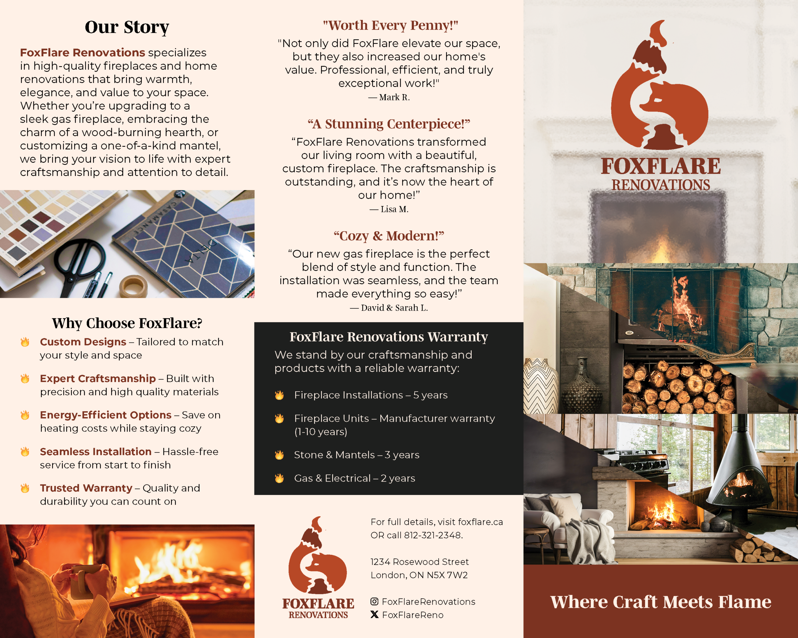 FoxFlare is a home renovation company that specializes in custom fireplace remodels. The brand combines professional craftsmanship with an approachable, inviting tone to help homeowners create warm, high-quality spaces. Its visual identity features a fox-shaped flame logo and a rich natural color palette, reflecting both expertise and personality. Brochures and marketing materials communicate services clearly and elegantly.