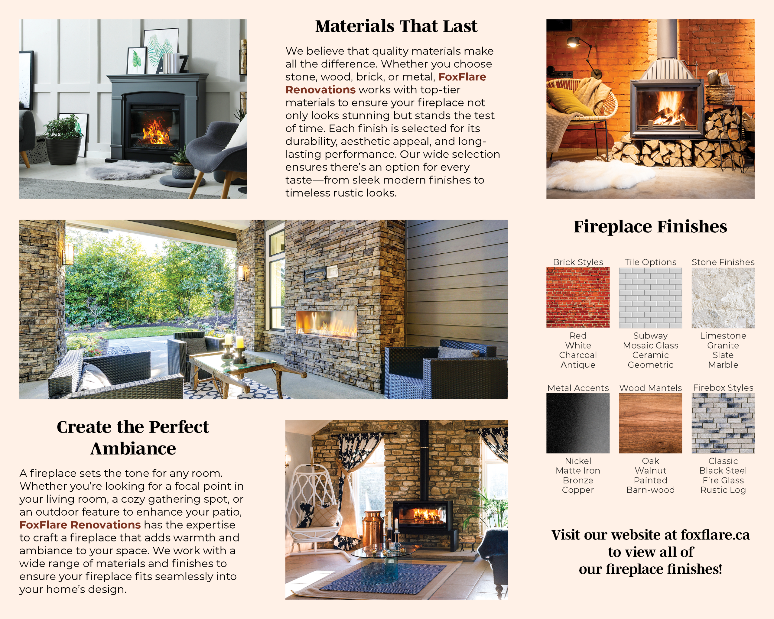 The project required designing a trifold brochure for FoxFlare, a home renovation company specializing in fireplace remodels. The objective was to create a sleek, modern, and professional brochure that showcases the company’s services, highlights custom designs and expert craftsmanship, and appeals to homeowners seeking highquality, long-lasting renovations.